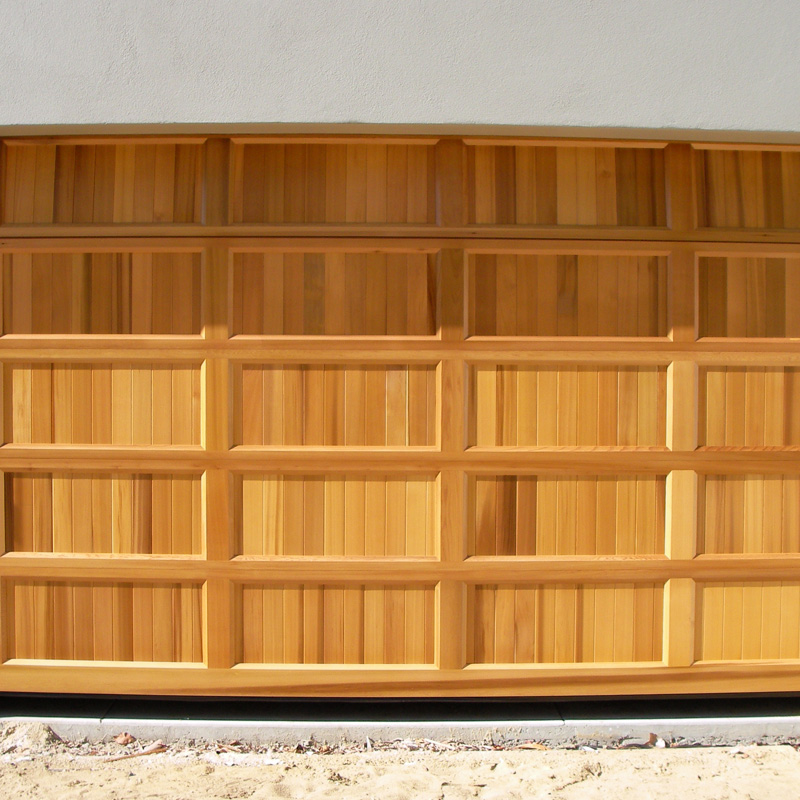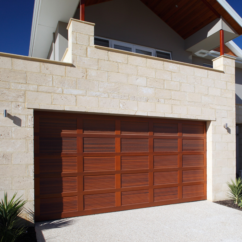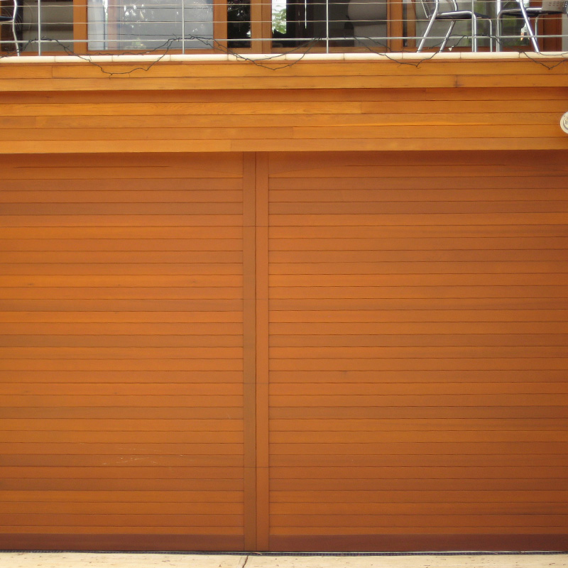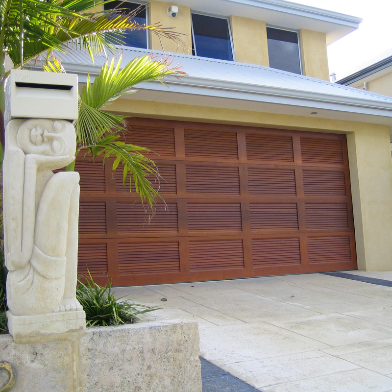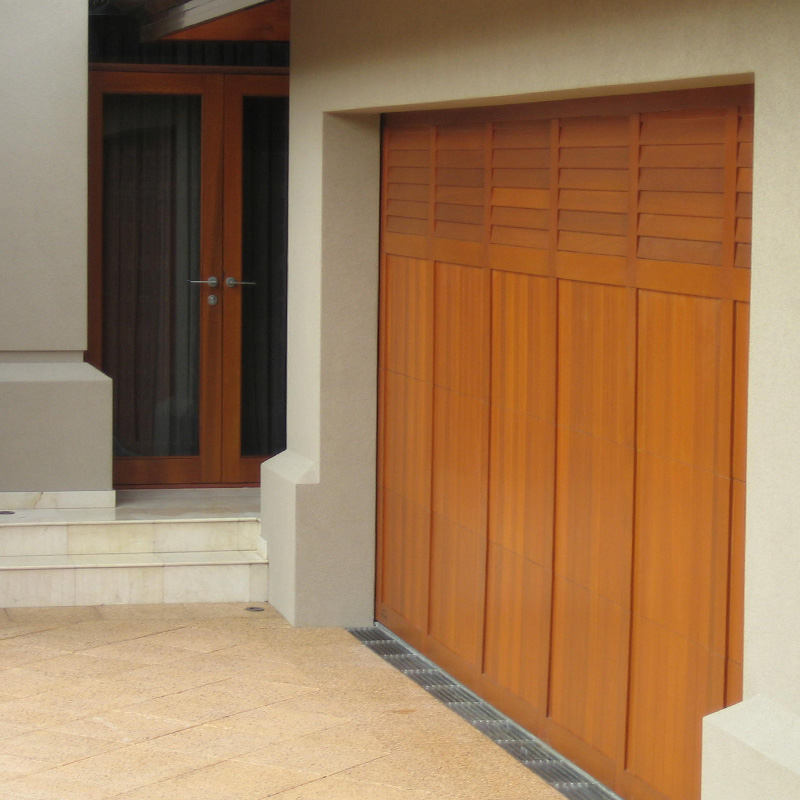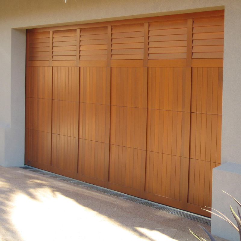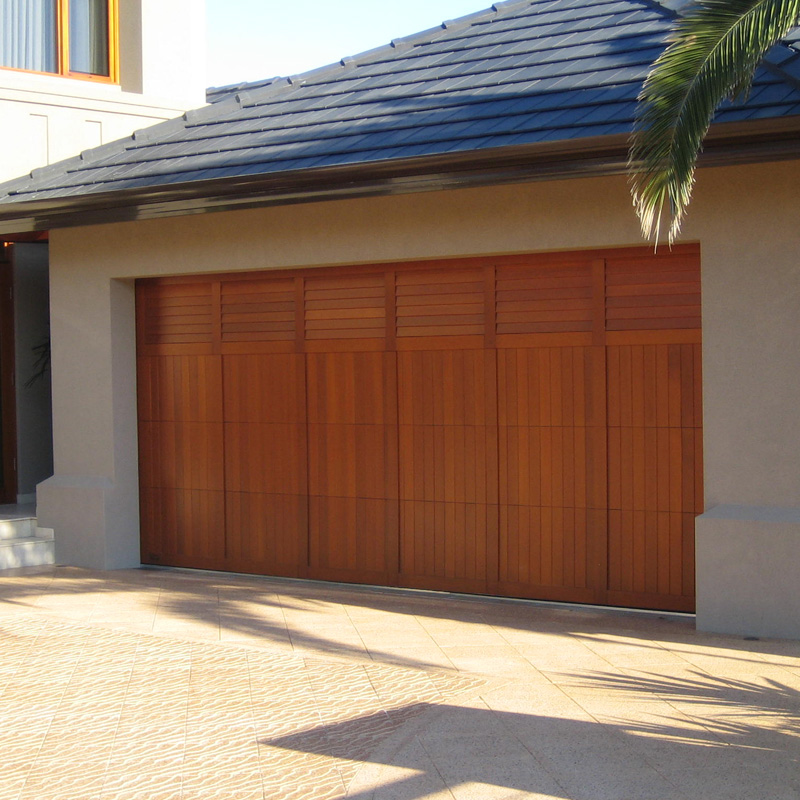 Solid Western Red Cedar garage door with opened or closed louvre panels.