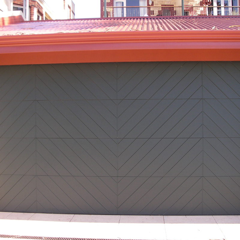 135mm Tongue and groove panelling is fixed to a custom design aluminium frame in a herringbone pattern. The Herringbone Panel is shown here in a Tilt format; however, it can easily be produced as a Sectional Garage Door.